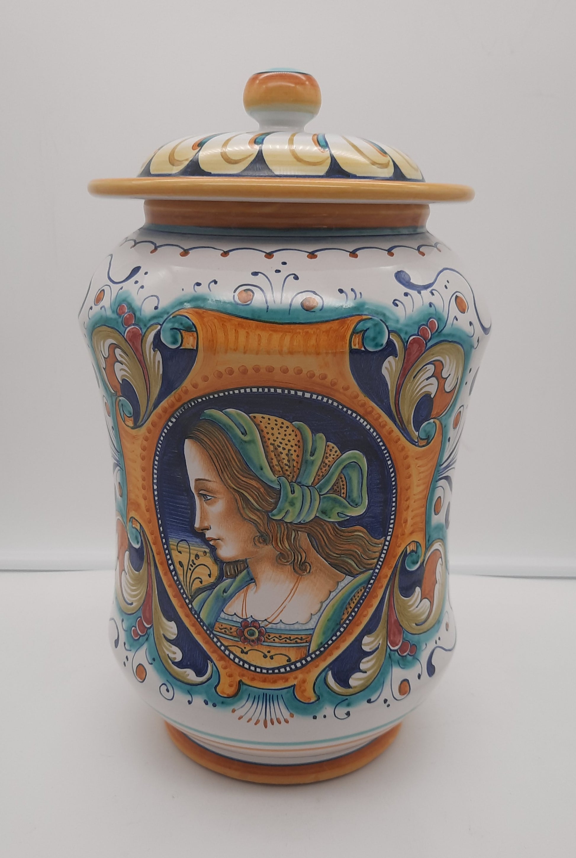 Barattolo classico farmacia cm 33 con Figura Femminile Rinascimentale interamente dipinto a mano