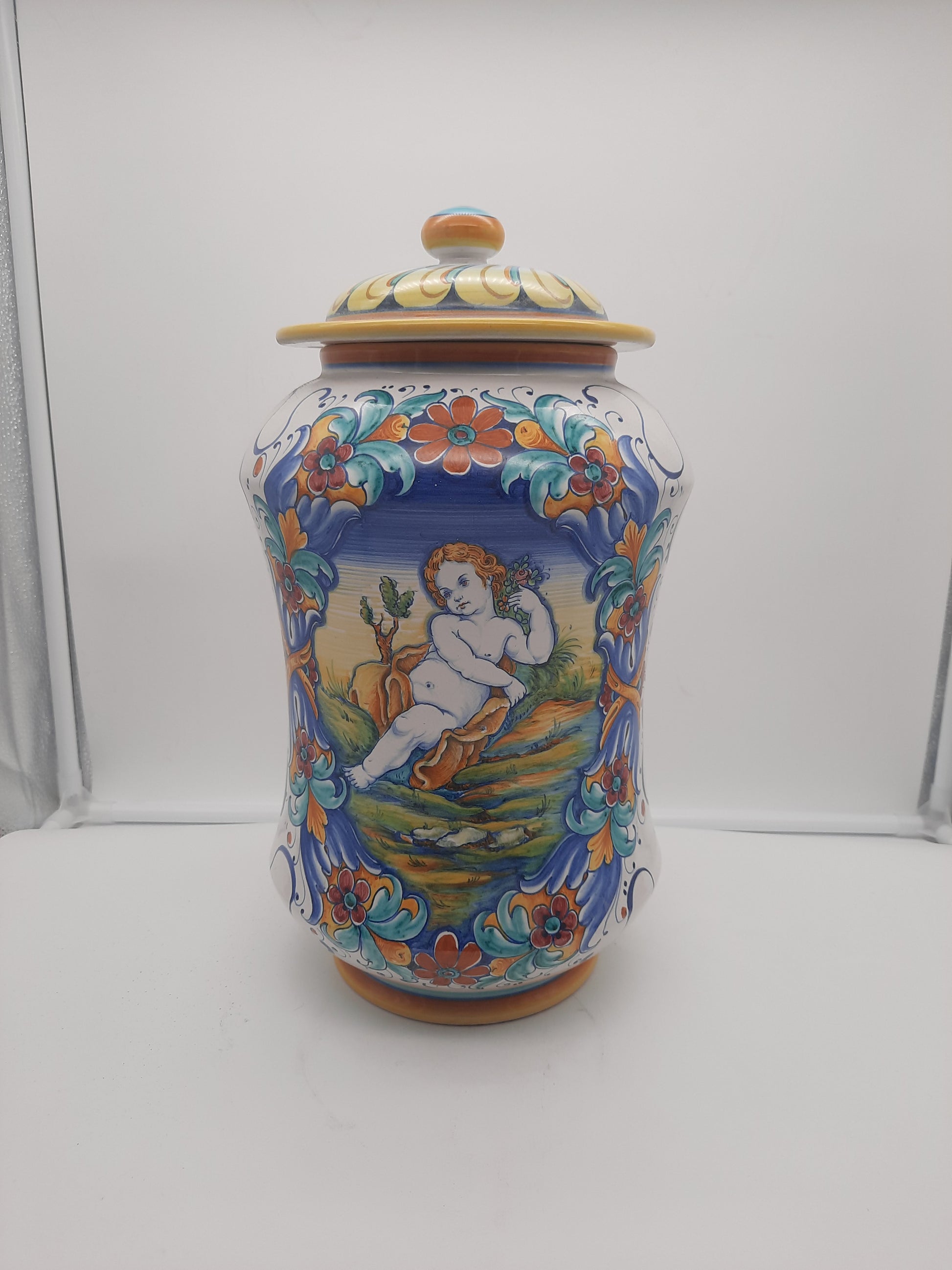 Barattolo classico cm 38 in ceramica interamente dipinto a mano. Decorato con Puttino al centro. Ideale per arredare le vostre case