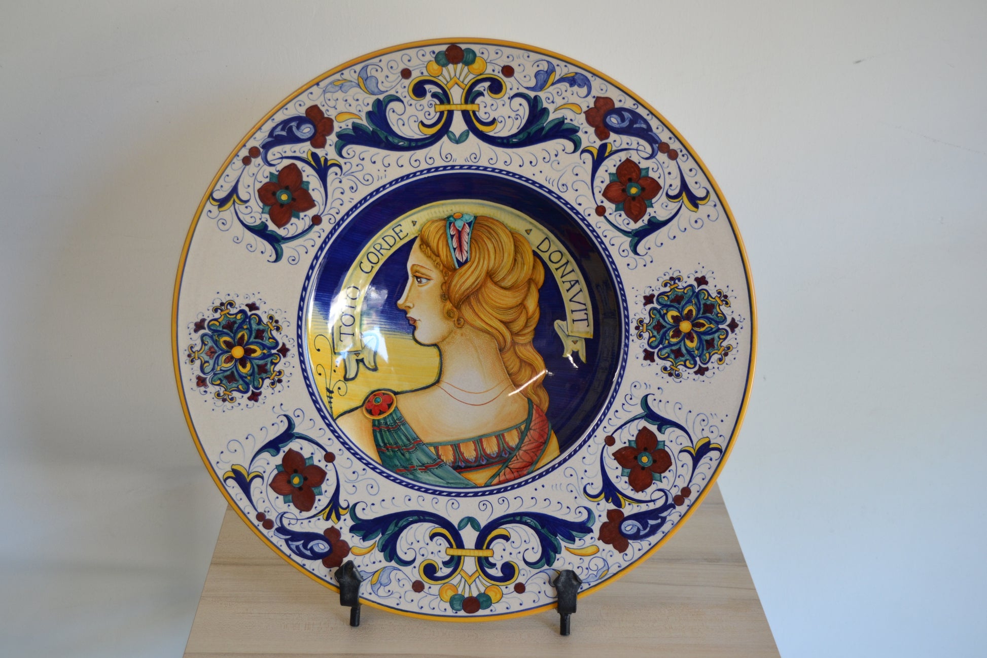 Piatto a cappello di prete cm 52 Donna Rinascimentale con Bordo Ricco Deruta in ceramica dipinto a mano
