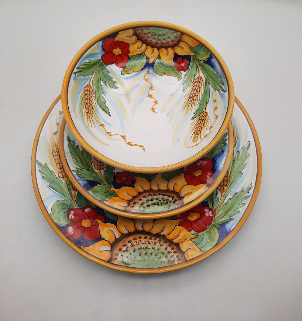 Posto tavola composto da 3 pezzi: piatto piano cm 28 piatto frutta o dolce cm 22, ciotola cm 20 ideale per una tavola estiva e fresca