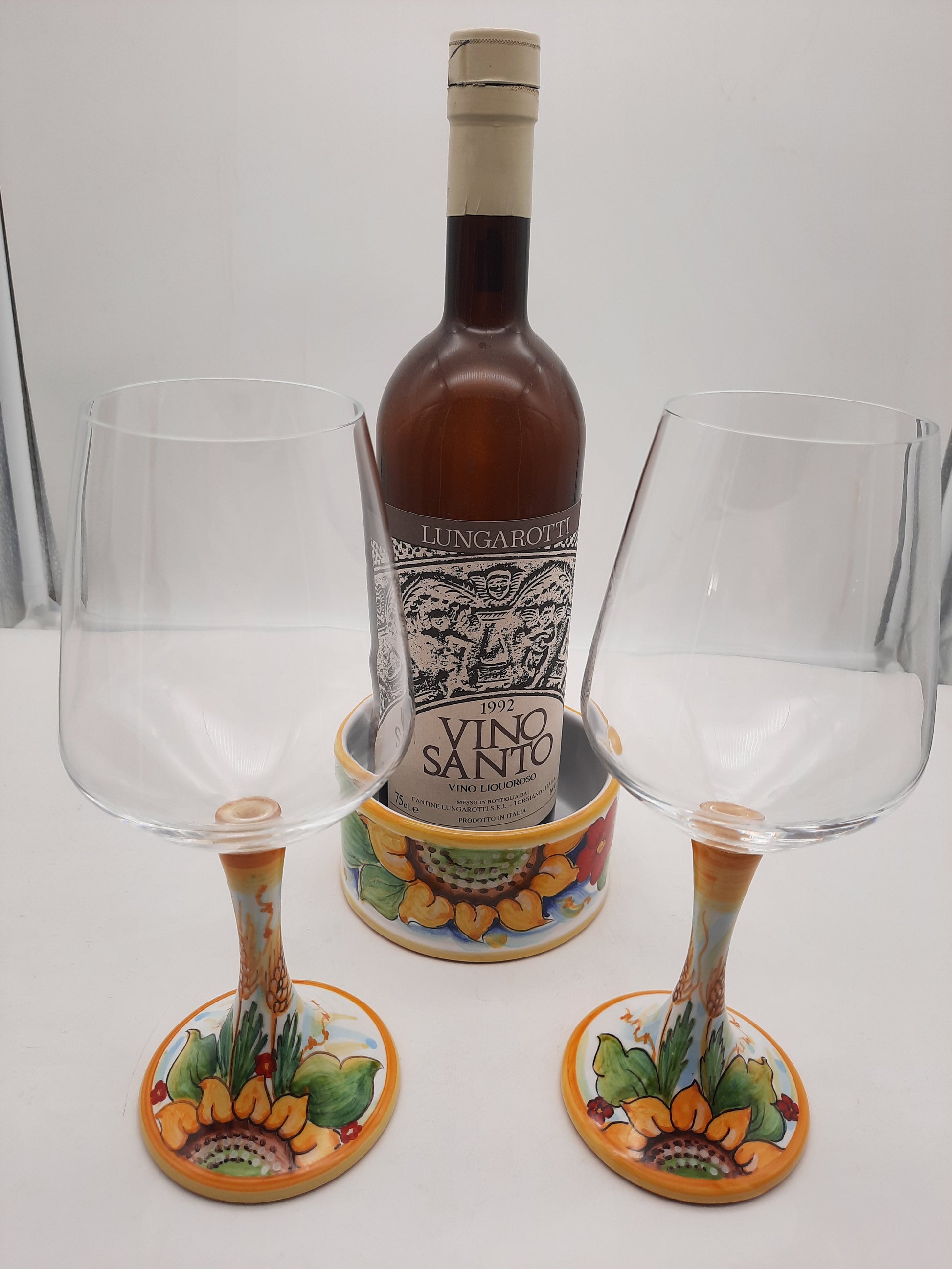 Coppia di calici con base in ceramica dipinti a mano e vetro cristallizzato con sottobottiglia abbinato.