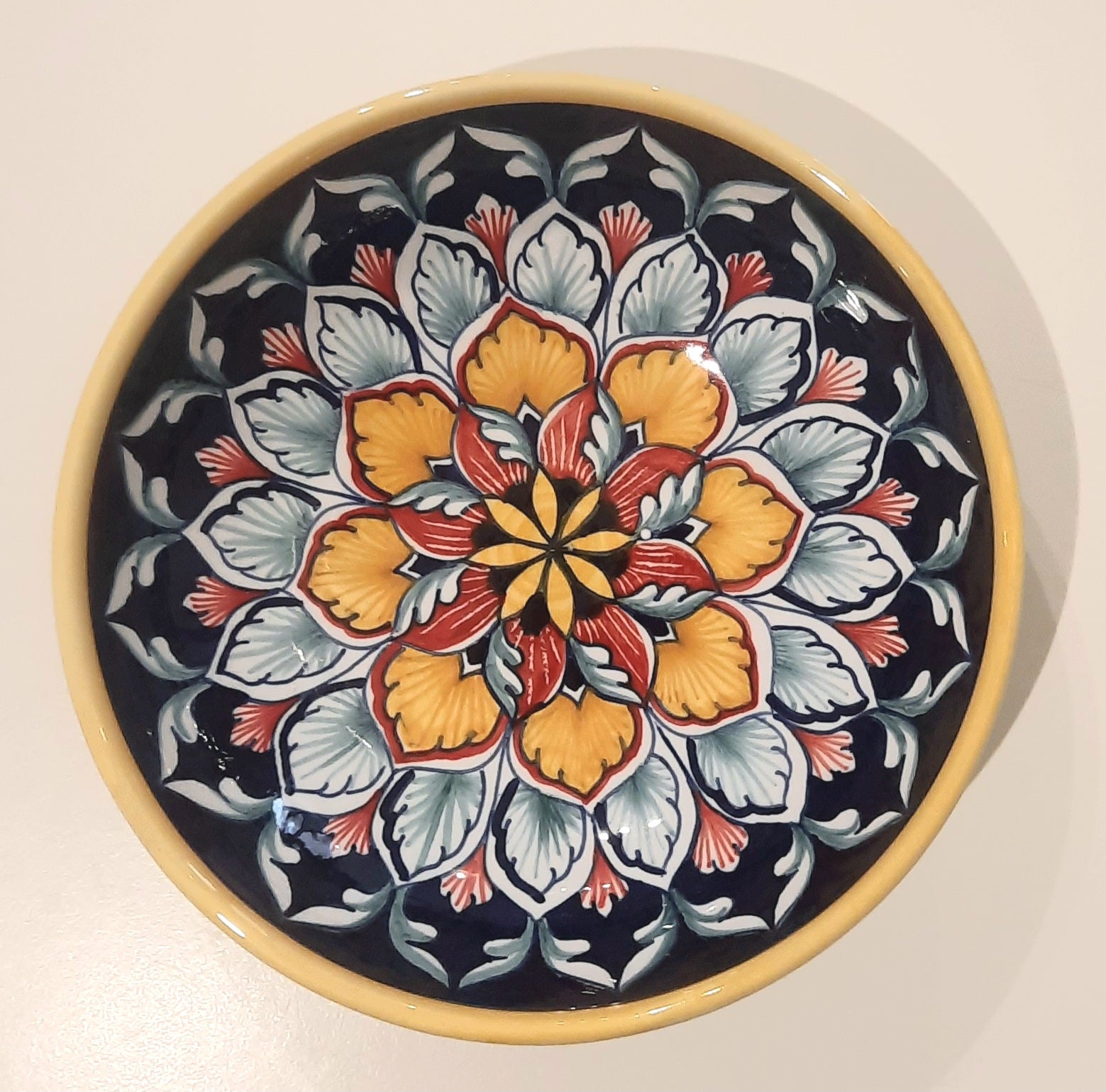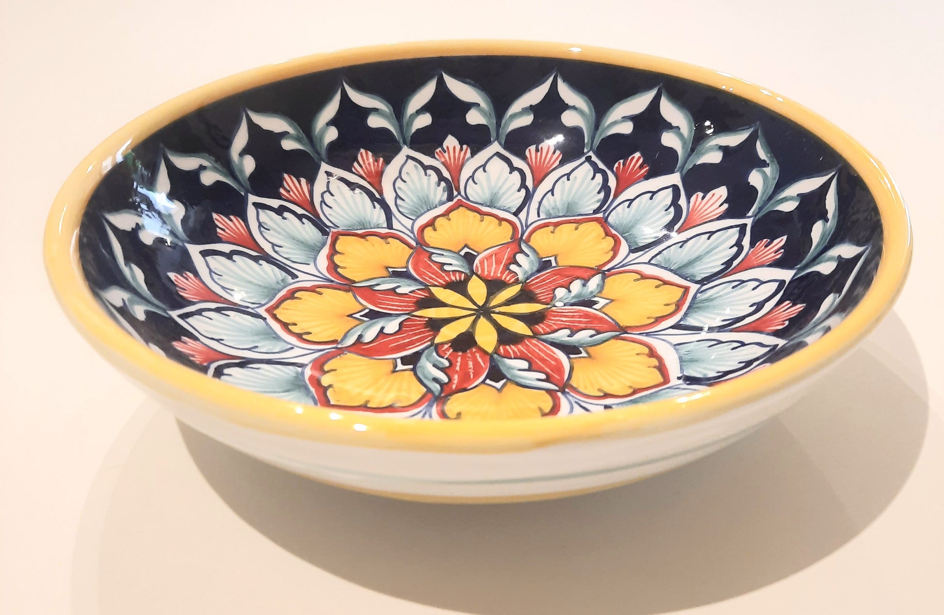 Ciotola o svuotasche cm 25 realizzato in Italia, dipinto a mano con un design geometrico. Un elemento di lusso di alta qualità, resistente e bello. Notato per il suo stile unico, è una scelta ideale per decorare la tua casa. I colori e lo smalto utilizzati per questa decorazione sono apionbici quindi adatti all'uso alimentare e sono il giallo, il blu, il verde, il rosso e il celeste