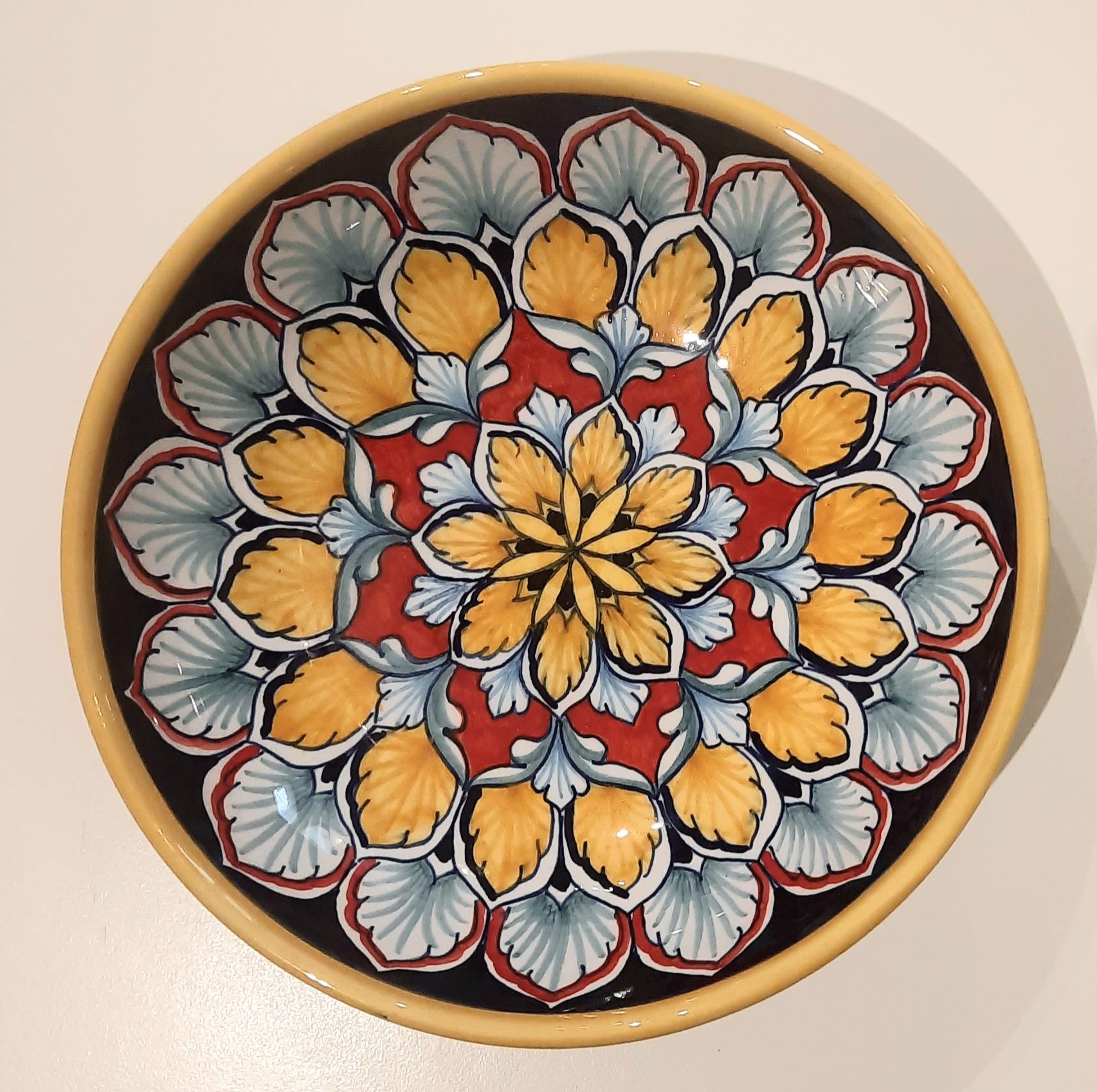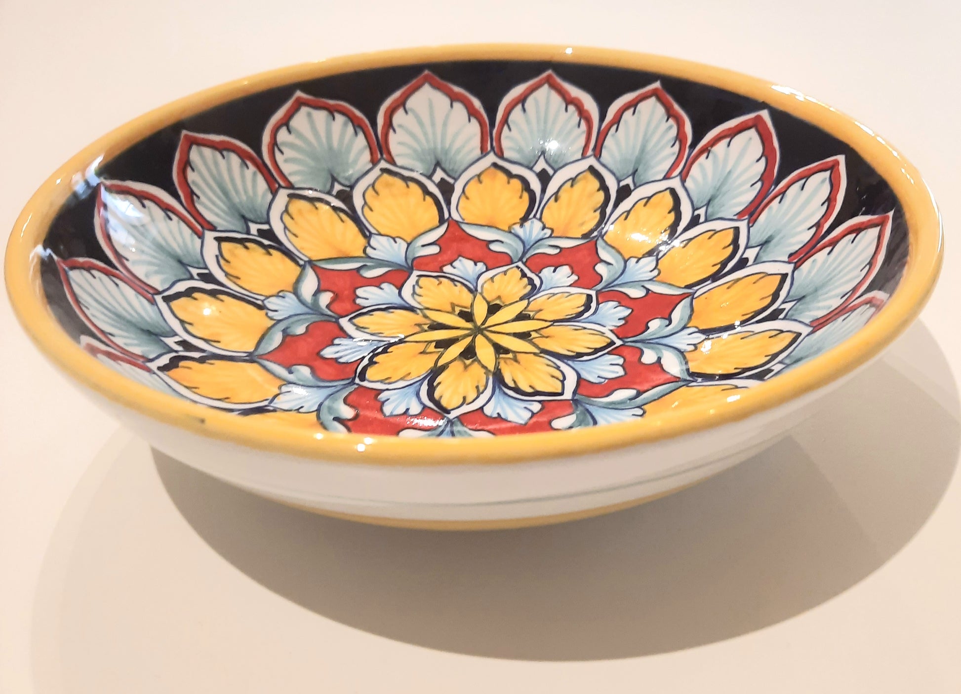 Ciotola o svuotasche cm 25 realizzato in Italia, dipinto a mano con un design geometrico. Un elemento di lusso di alta qualità, resistente e bello. Notato per il suo stile unico, è una scelta ideale per decorare la tua casa. I colori e lo smalto utilizzati per questa decorazione sono apionbici quindi adatti all'uso alimentare e sono il giallo, il blu, il verde, il rosso e il celeste