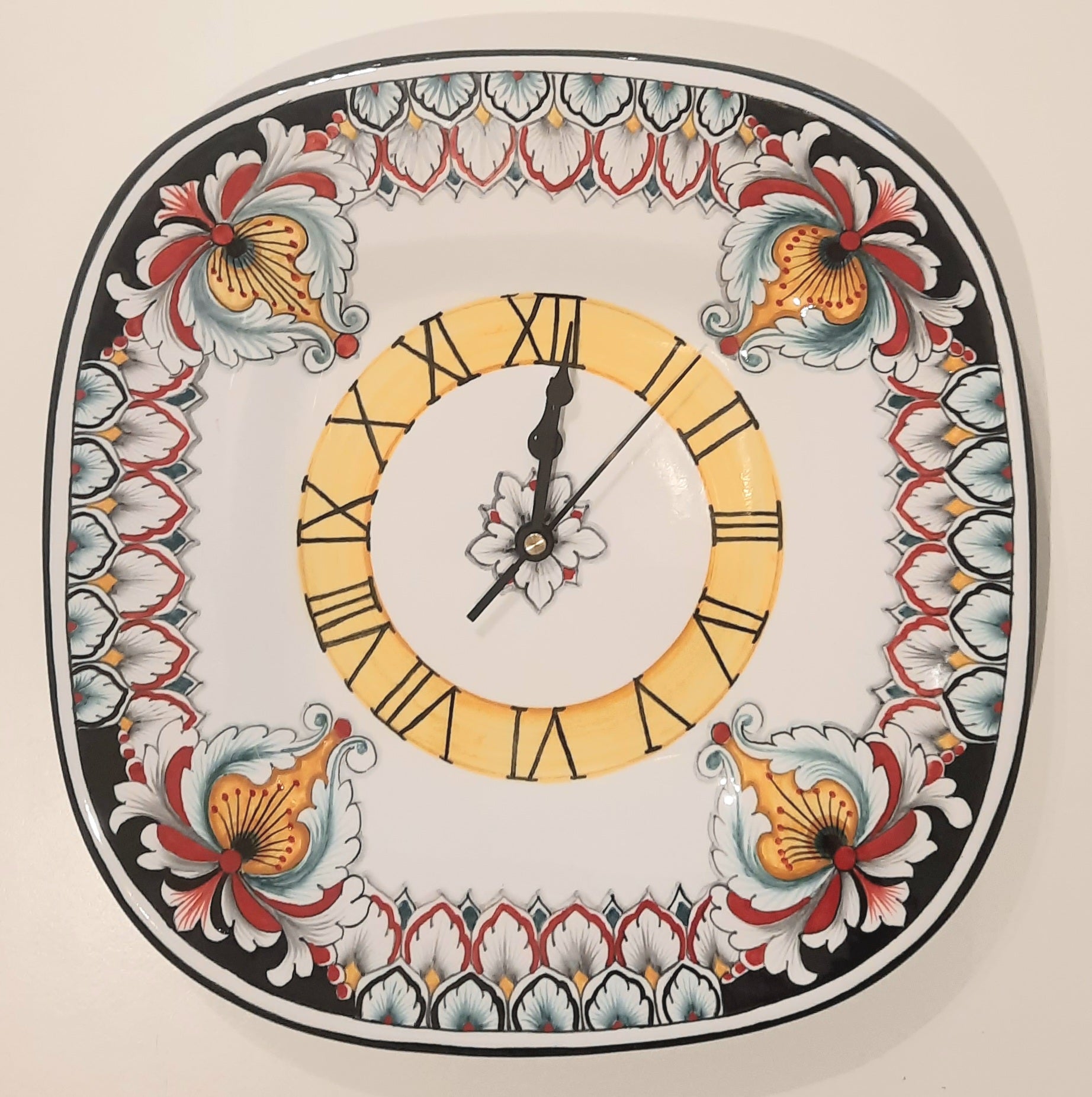 Orologio quadrato 30x30 già completo di meccanismo e predisposizione per essere appeso. I colori usati in questo decoro sono il giallo, l'arancio, il nero, il verde, il rosso vivo.
