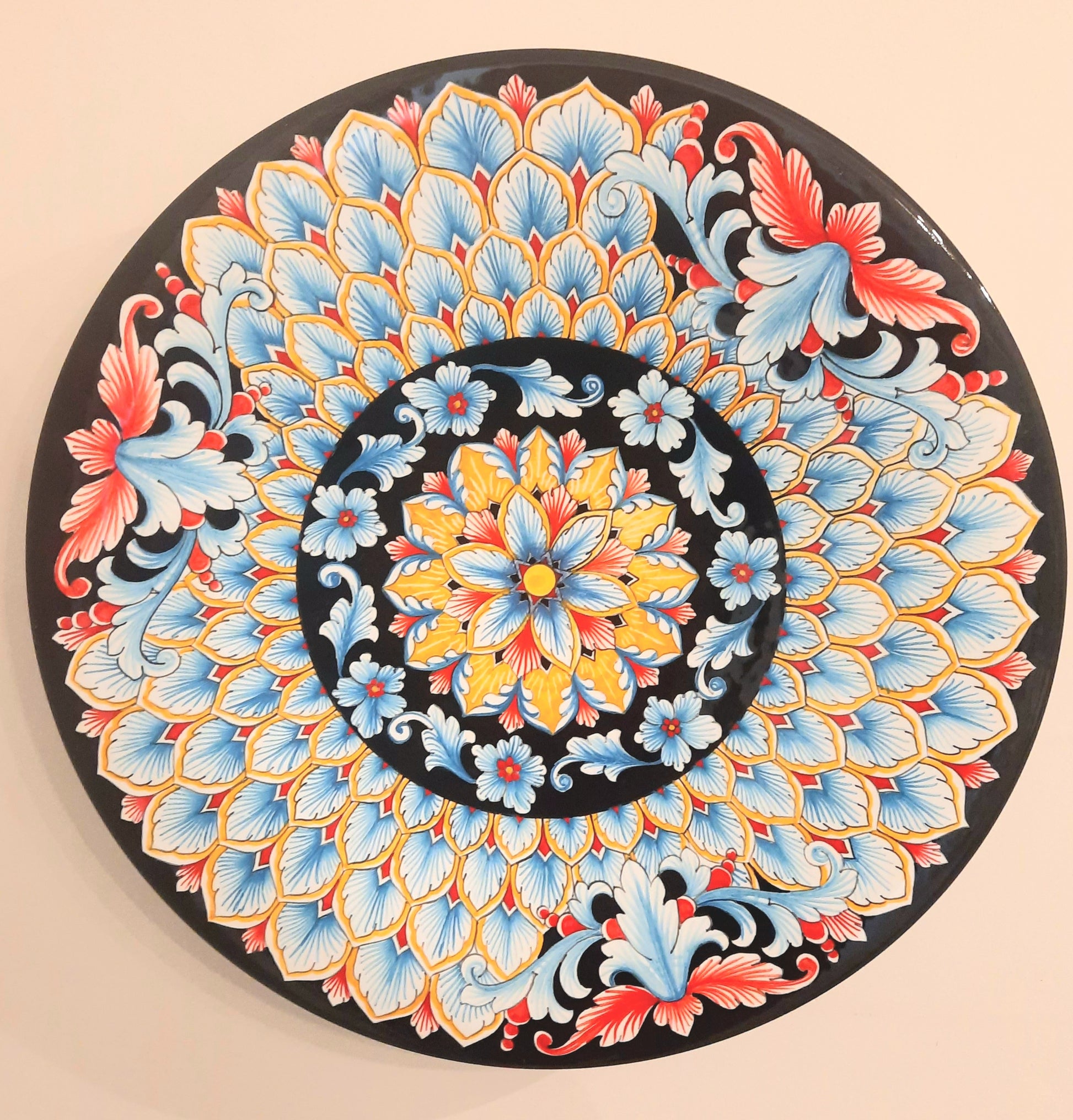 Piatto onda da muro o centrotavola cm 42 realizzato in Italia, dipinto a mano con un design geometrico. Un elemento di lusso di alta qualità, resistente e bello. Notato per il suo stile unico, è una scelta ideale per decorare la tua casa. I colori utilizzati in questa decorazione sono il giallo, l'arancio, il blù scuro e il celeste.
