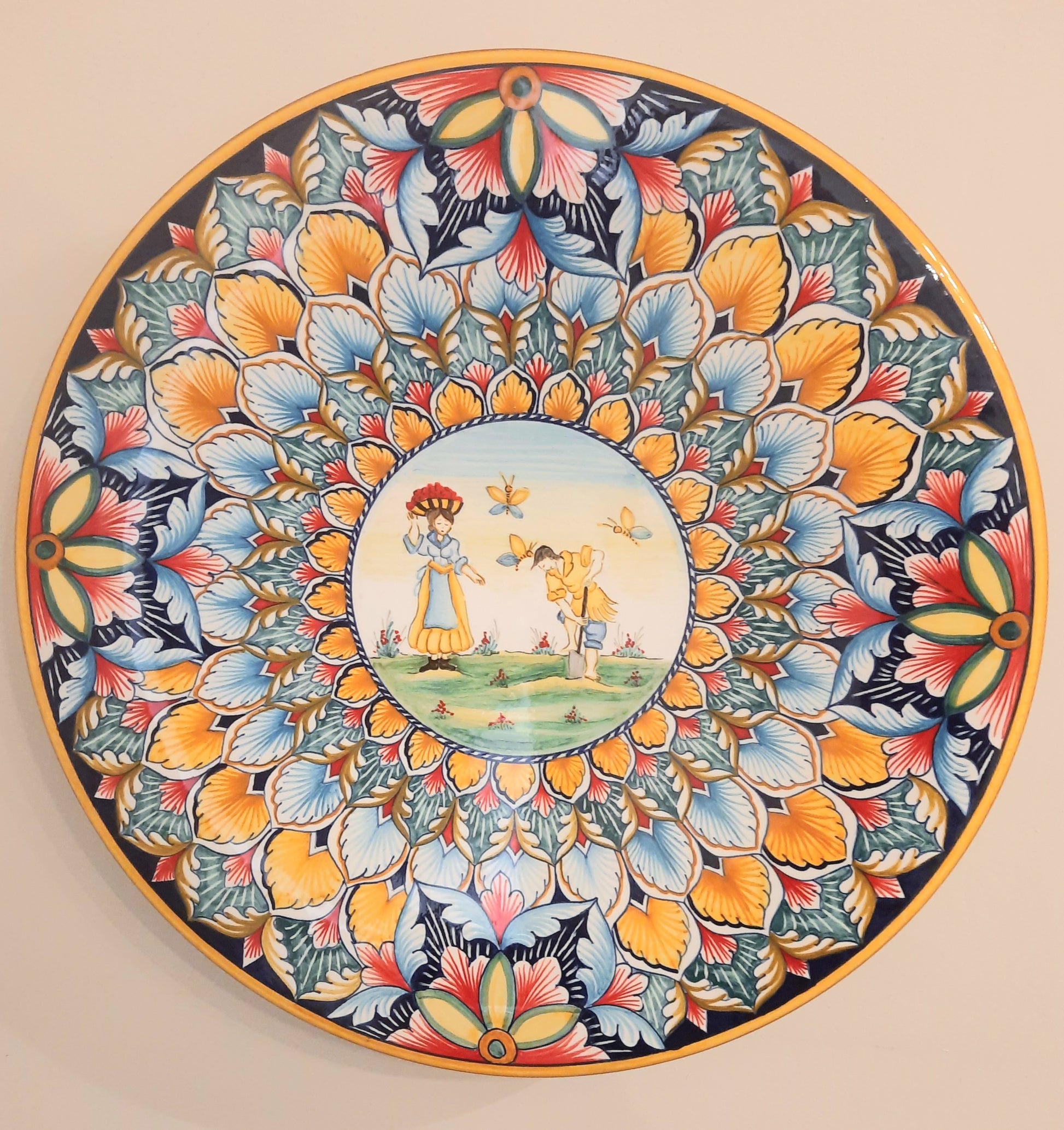 Piatto onda da muro o centrotavola cm 42 realizzato in Italia, dipinto a mano con un design geometrico. Un elemento di lusso di alta qualità, resistente e bello. Notato per il suo stile unico, è una scelta ideale per decorare la tua casa. I colori utilizzati in questa decorazione sono il giallo, l'arancio, il blù scuro e il celeste, il verde e il verde senape.