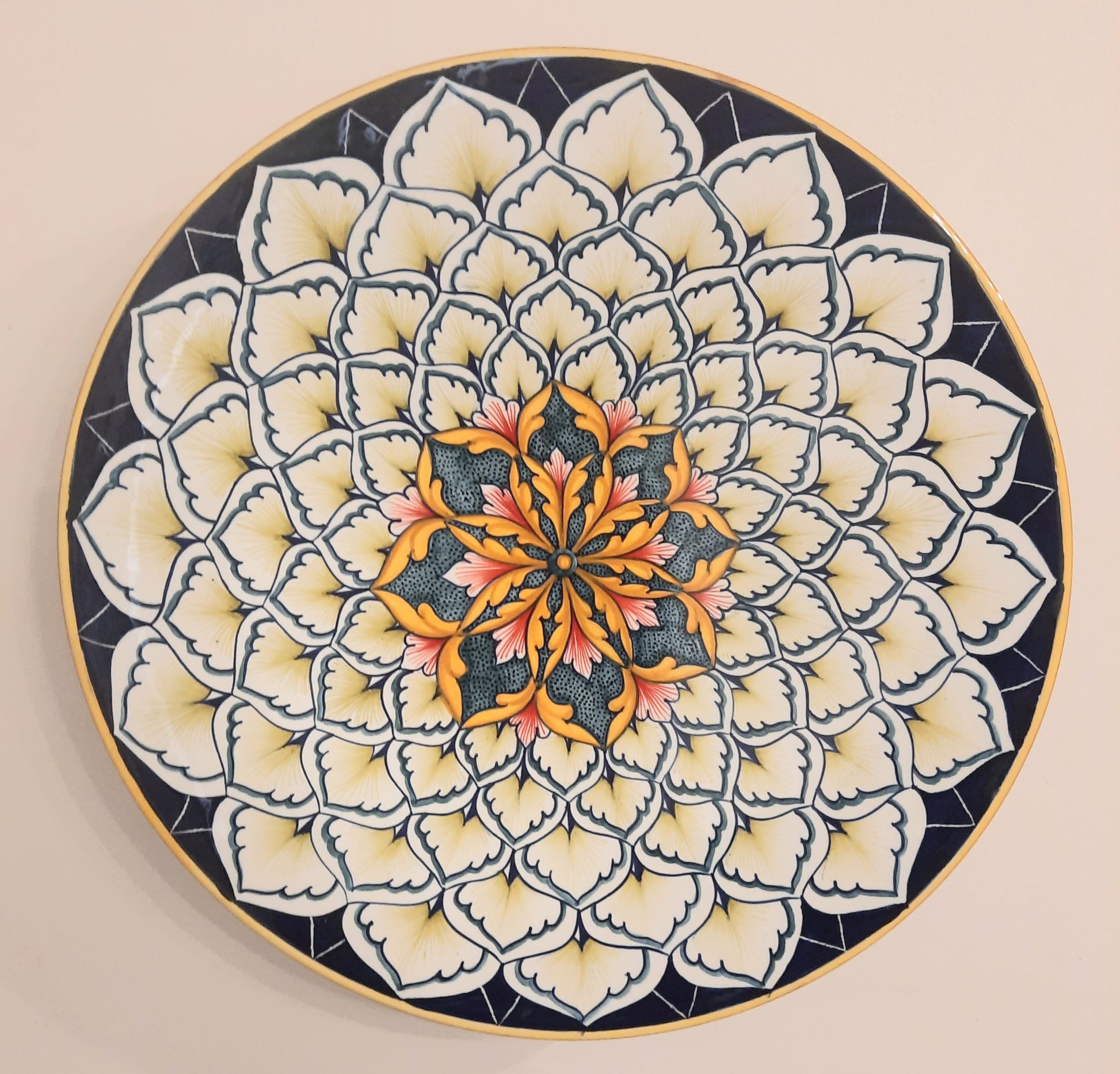 Piatto onda da muro o centrotavola cm 42 realizzato in Italia, dipinto a mano con un design geometrico. Un elemento di lusso di alta qualità, resistente e bello. Notato per il suo stile unico, è una scelta ideale per decorare la tua casa. I colori utilizzati in questa decorazione sono il giallo, l'arancio, il blù scuro e il celeste e il verde senape.