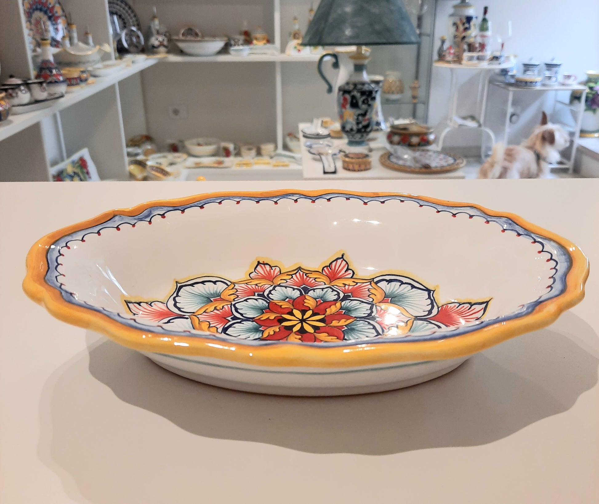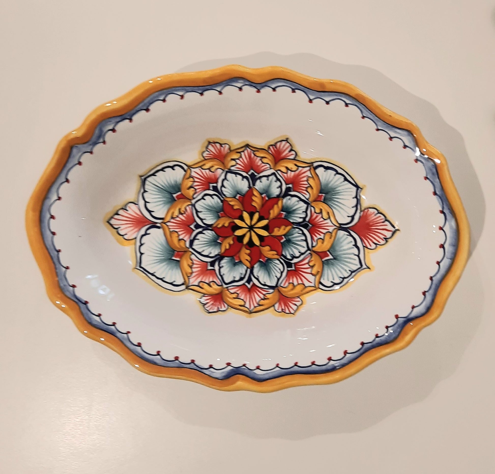 Ciotola ovale smerlata 25x9x5. I colori e gli smalti utilizzati per questo decoro sono apiombici quindi adatti all'uso alimentare e sono il giallo, l'arancio, il rosso vivo, il verde e il celeste.