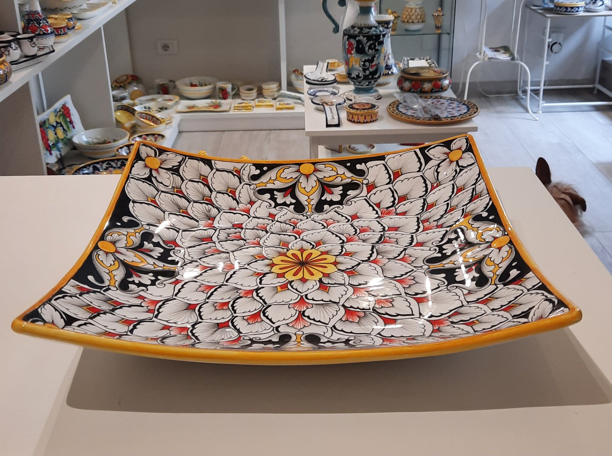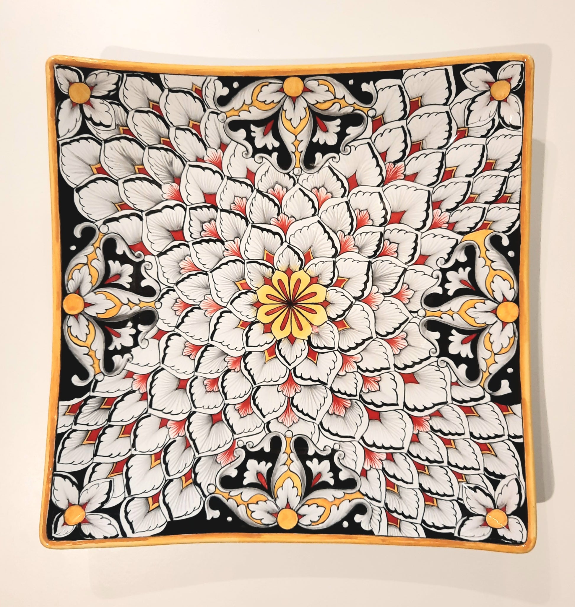 Centrotavola quadrato cm 38x38x8. I colori e gli smalti utilizzati per questo decoro sono apiombici quindi adatti all'uso alimentare e sono il giallo, l'arancio, il rosso vivo e il nero.